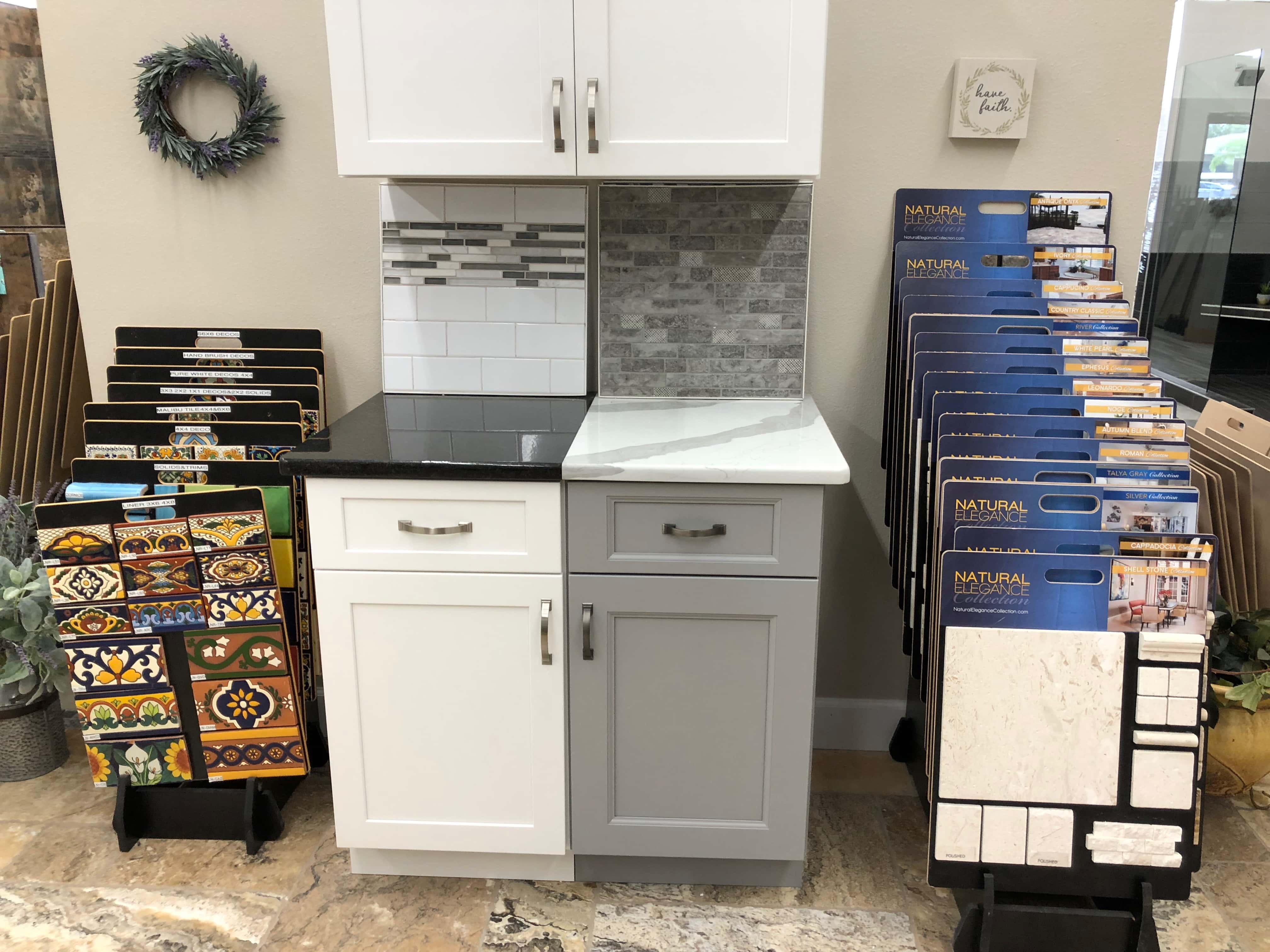 In our Design Studio to make it easier to visualize, we have five different cabinet & countertop combinations, as well as these backsplash boards that we made. You can set any of them on a countertop to see what that type of backsplash would look like installed. We have a variety of backsplash options and we are available to help you look through them! And because we know it can be difficult to tell if something will go in your kitchen without it being there we encourage you to take samples home with you.