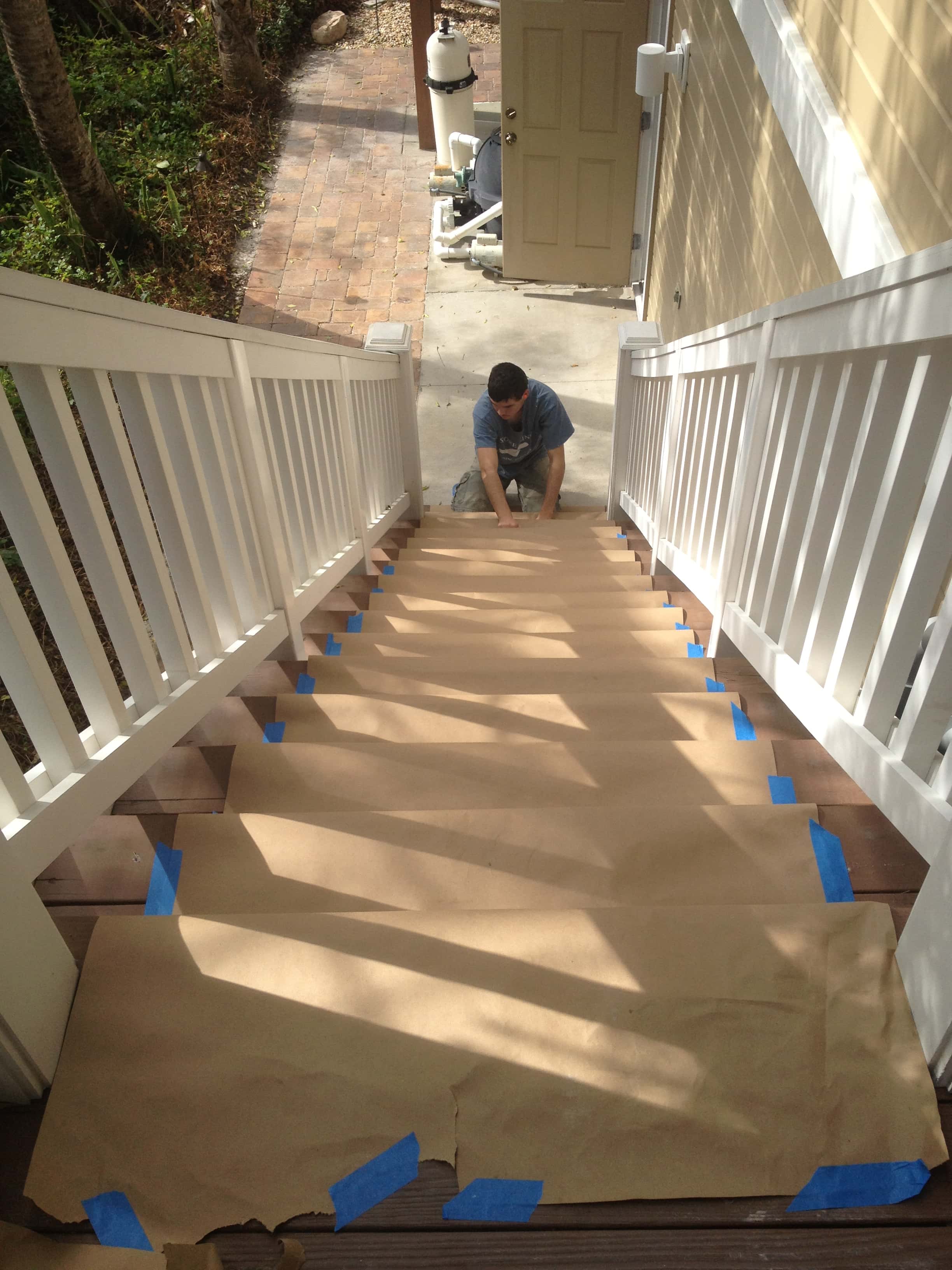 Josiah putting paper on stairs to protect them–we do our best to leave your place looking better than when we found it.