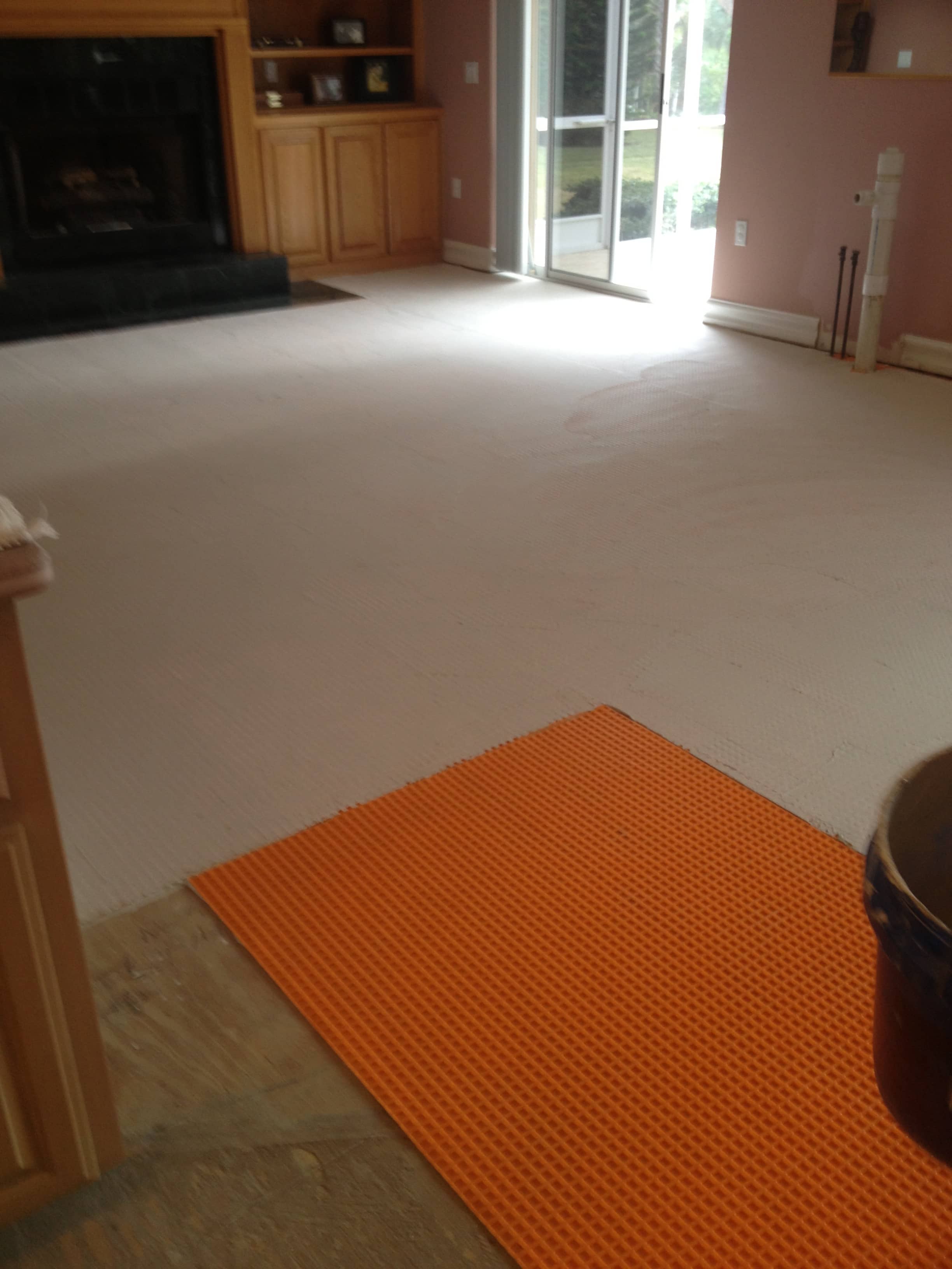 Ditra mostly covered with thinset… at Sandra’s house in Cape Haze. Ditra is what they call an “uncoupling membrane”, which basically means that it separates your tile from the substrate. (wood or concrete) This is good news, because normally whenever your substrate cracks, so does your tile floor. This way, they are independent of each other, so you have way less cracking–plus several other benefits. Ask Rob or Hannah for more details!
