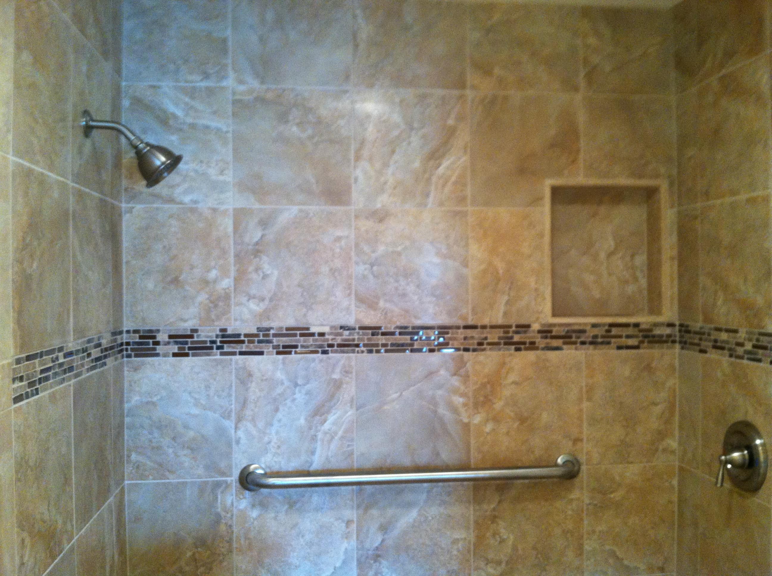 “Red Maple” tile in a shower we did for the Aroyas in Englewood, FL (from Ultimate Upgrades.)