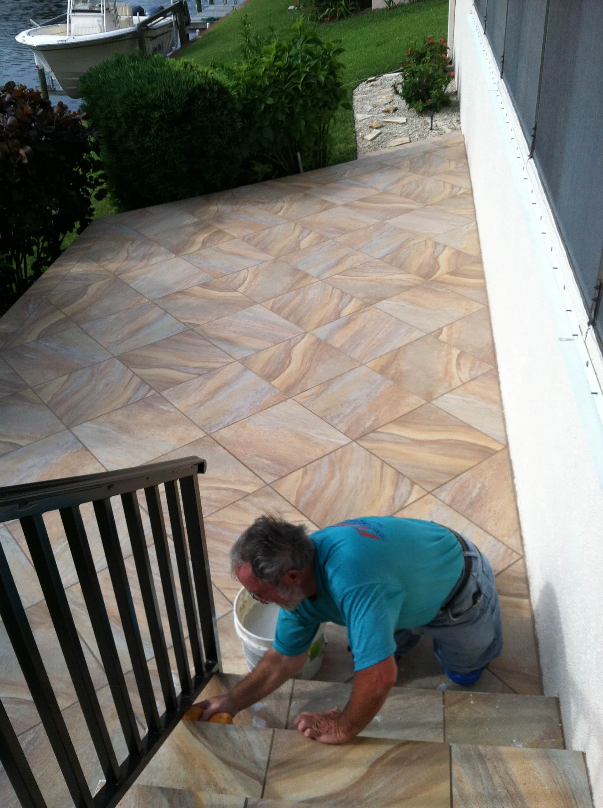 And here’s Rich wiping the steps of a porch we did in Englewood, Florida for Alice and Gene Anastasi with our “Sunset” tile. This was grouted with the new Power Grout. We heard about it at the “Coverings” international floor coverings conference, and we’re among the first in this area to begin using this awesome technology.