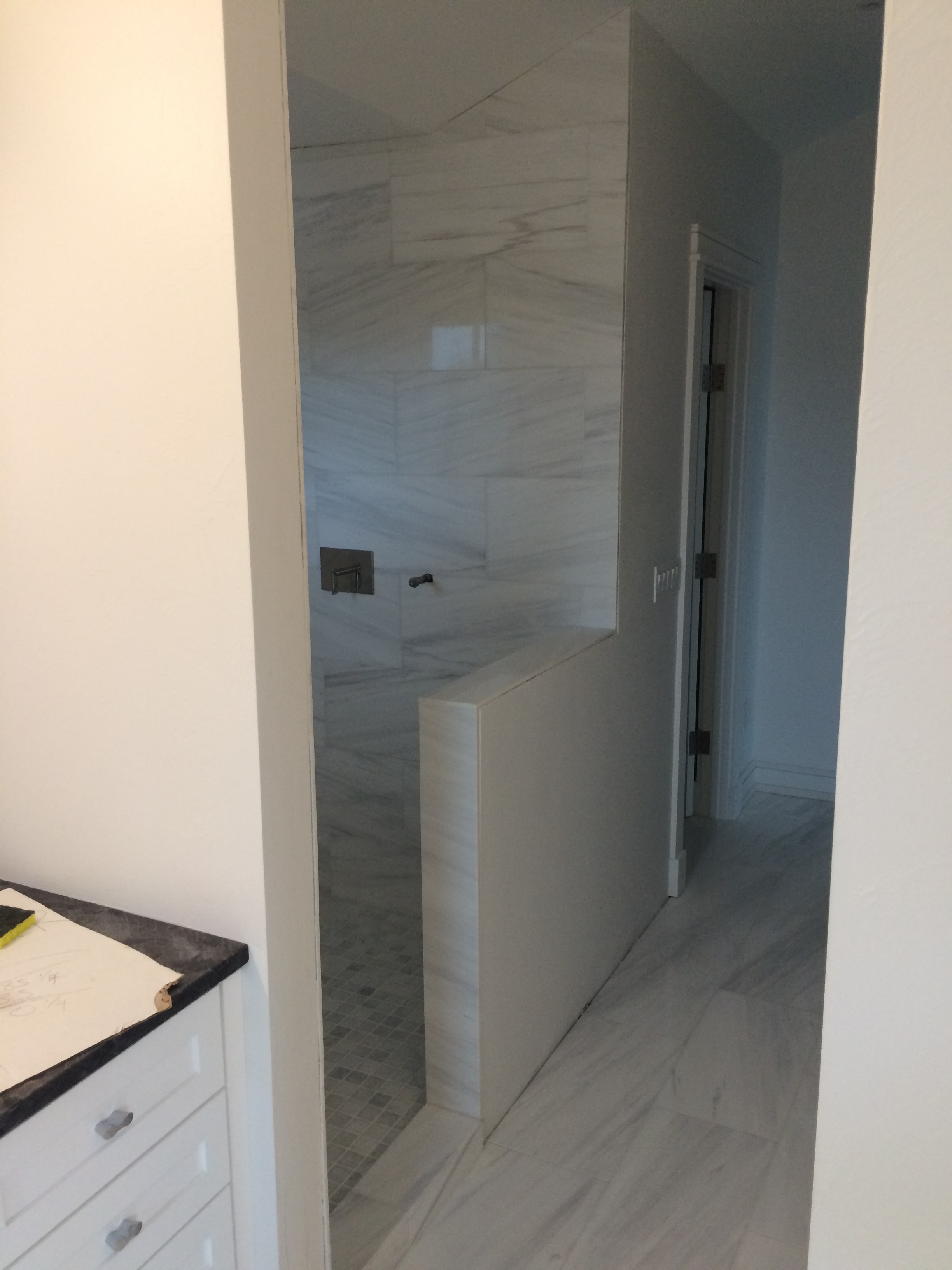 Another job that we recently completed had beautiful stone that we installed. These are one of the bathrooms that we did.